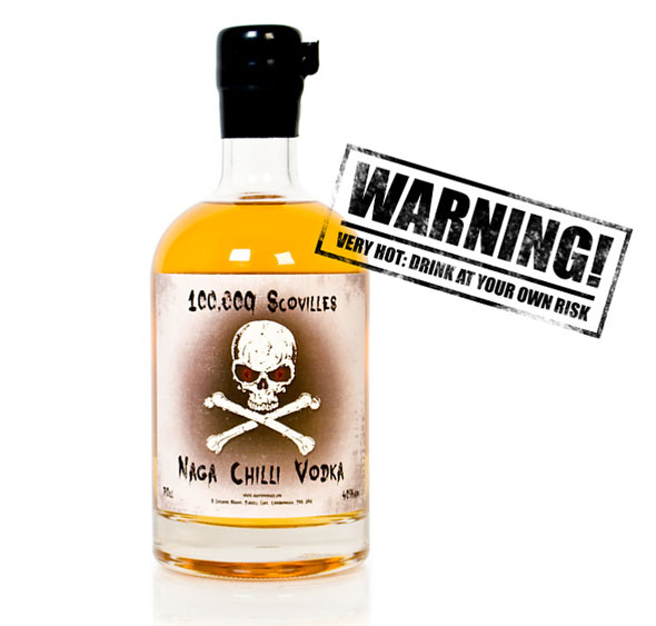Naga Chilli Vodka claims to be 100,000 scovilles hot, which according to the makers is up there with habanero peppers. They warn against even drinking this in full shots. (via foodiggity.com ).